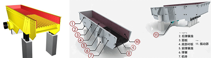 ZSW振動給料機(jī)主要由振動機(jī)架、彈簧、振動器、電機(jī)振動架及電機(jī)等組成。激振器個是由二特定位置的偏心軸以齒輪相嚙合組成,裝配時必須使兩齒輪按標(biāo)記相嚙合,通過電機(jī)驅(qū)動,使兩偏心軸旋轉(zhuǎn),從而產(chǎn)生巨大合成的直線激振力,使機(jī)體在支承彈簧上作強(qiáng)制振動,物料則以此振動為動力,在料槽上作滑動及拋擲運(yùn)動,從而使物料前移而達(dá)到給料目的。當(dāng)物料通過槽體上的篩條時,較小的料可通過篩條間隙而落下,可不經(jīng)過下道的破碎工序,起了篩分的效果,提高了工作效率。